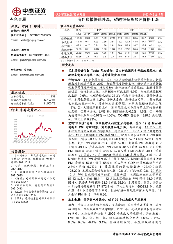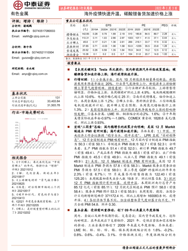 【中泰证券】【20220103】20220103-中泰证券-有色金属行业周报:海外疫情快速升温,碳酸锂备货加速价格上涨-46页