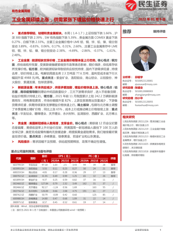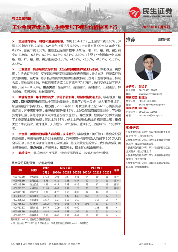 【民生证券】【20220109】20220109-民生证券-有色金属周报:工业金属延续上涨,供需紧张下锂盐价格快速上行-26页