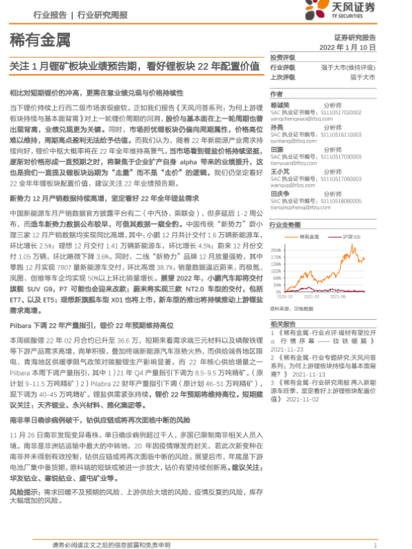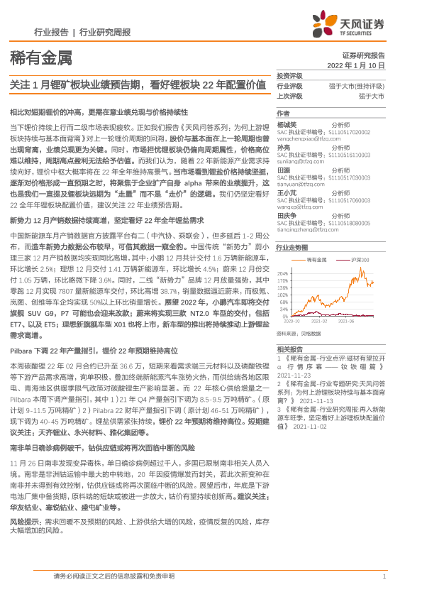 【天风证券】【20220110】稀有金属:关注1月锂矿板块业绩预告期,看好锂板块22年配置价值-18页