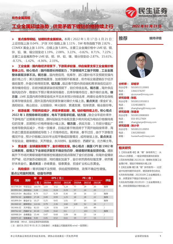 【民生证券】【20220123】20220123-民生证券-有色金属周报:工业金属延续涨势,供需矛盾下锂钴价格持续上行-27页