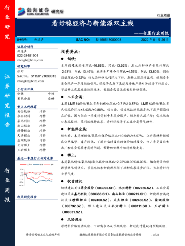 【渤海证券】【20220126】20220126-渤海证券-金属行业周报:看好稳经济与新能源双主线-21页