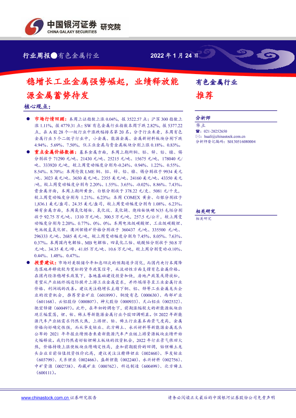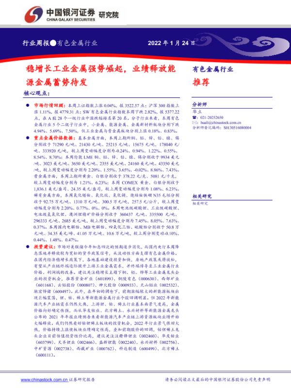 【银河证券】【20220124】中国银河-有色金属行业周报:稳增长工业金属强势崛起,业绩释放能源金属蓄势待发-19页