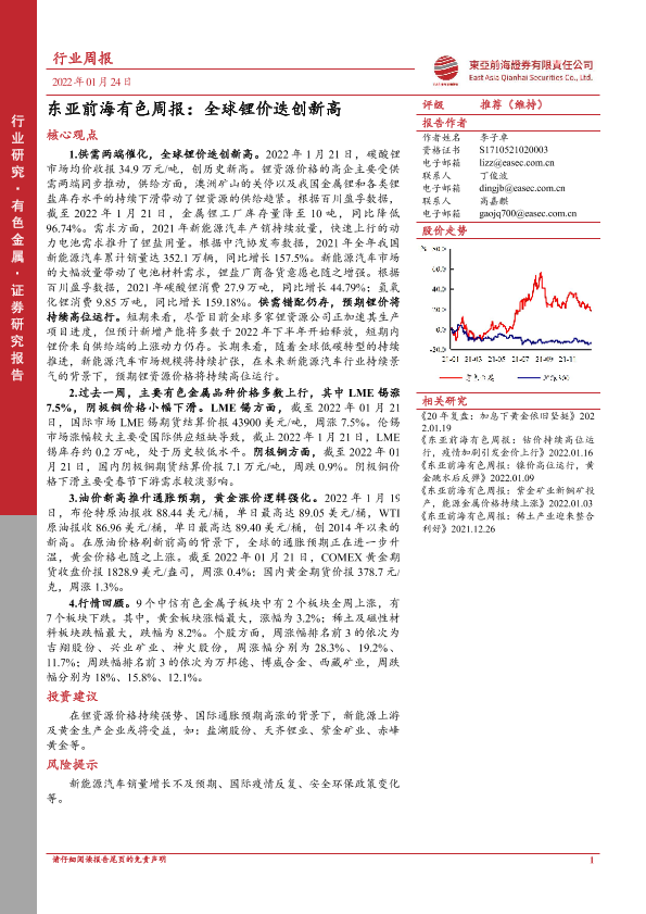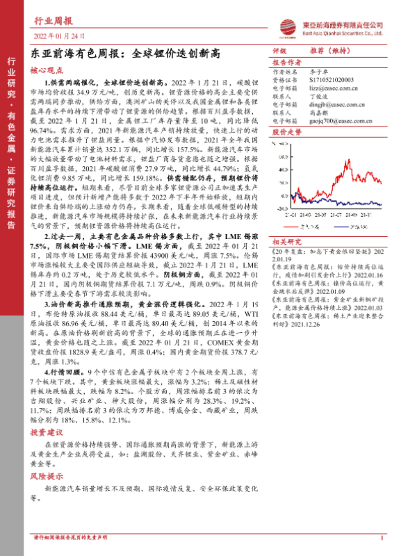 【东亚前海证券】【20220124】东亚前海有色周报:全球锂价迭创新高-20页