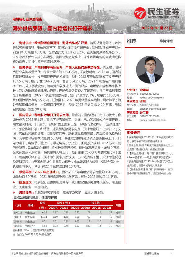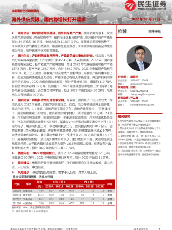 【民生证券】【20220127】20220127-民生证券-电解铝行业深度报告:海外供应受限,国内稳增长打开需求-38页