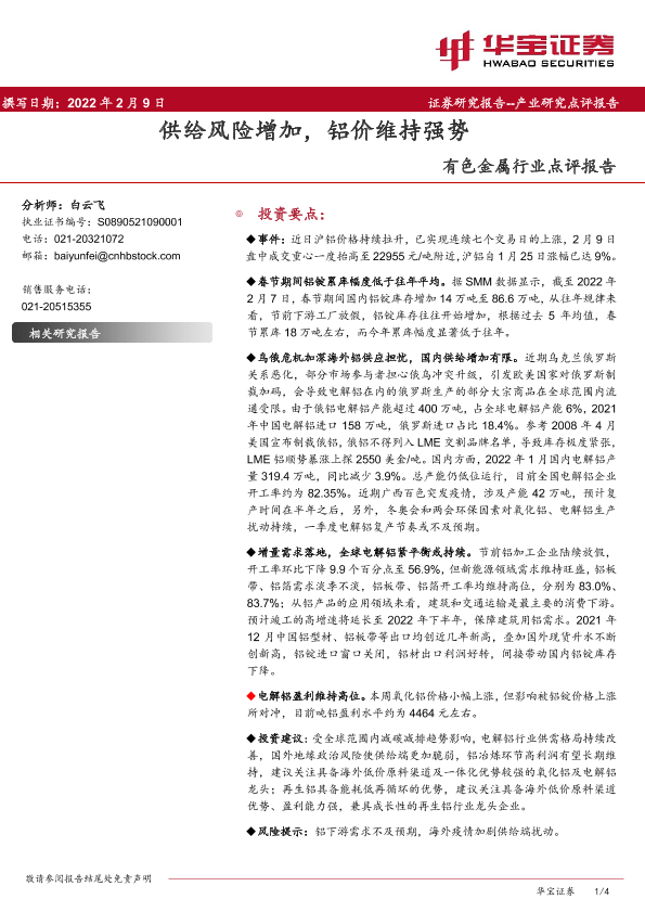 【华宝证券】【20220209】有色金属行业点评报告:供给风险增加,铝价维持强势-4页