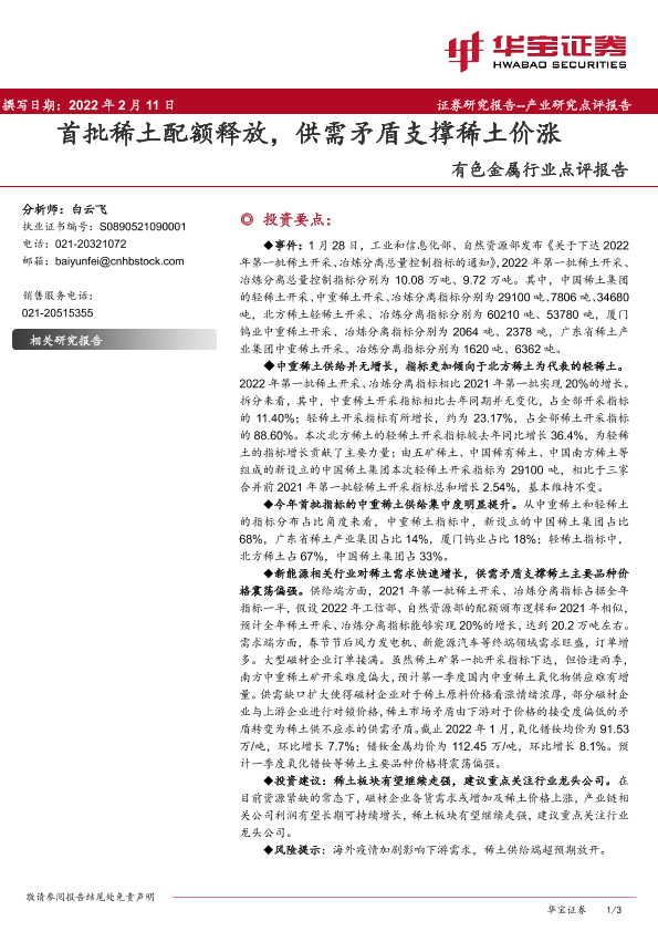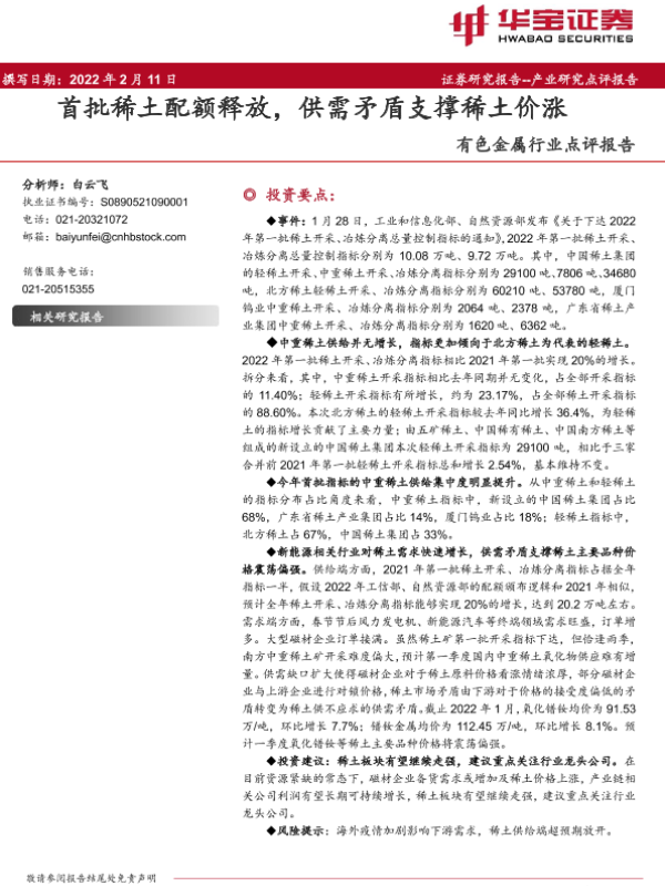 【华宝证券】【20220211】20220211-华宝证券-有色金属行业点评报告:首批稀土配额释放,供需矛盾支撑稀土价涨-3页