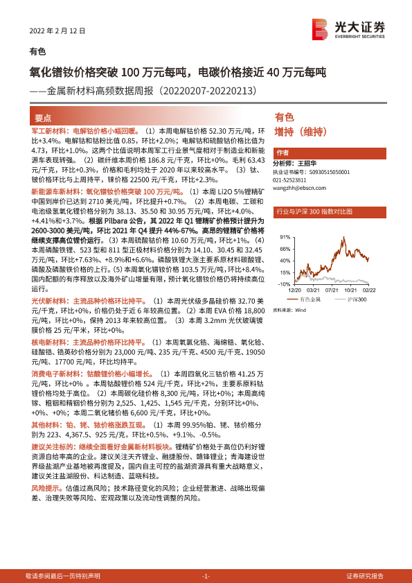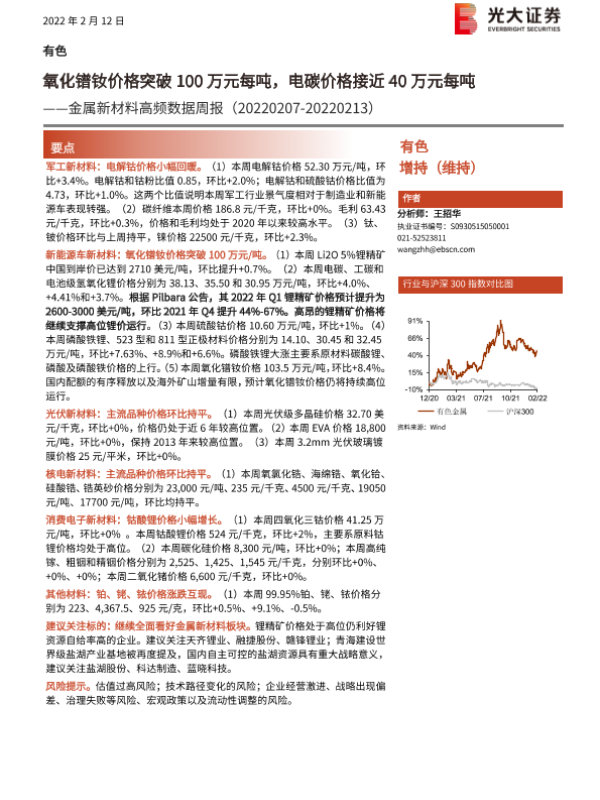 【光大证券】【20220213】金属新材料高频数据周报:氧化镨钕价格突破100万元每吨,电碳价格接近40万元每吨-26页