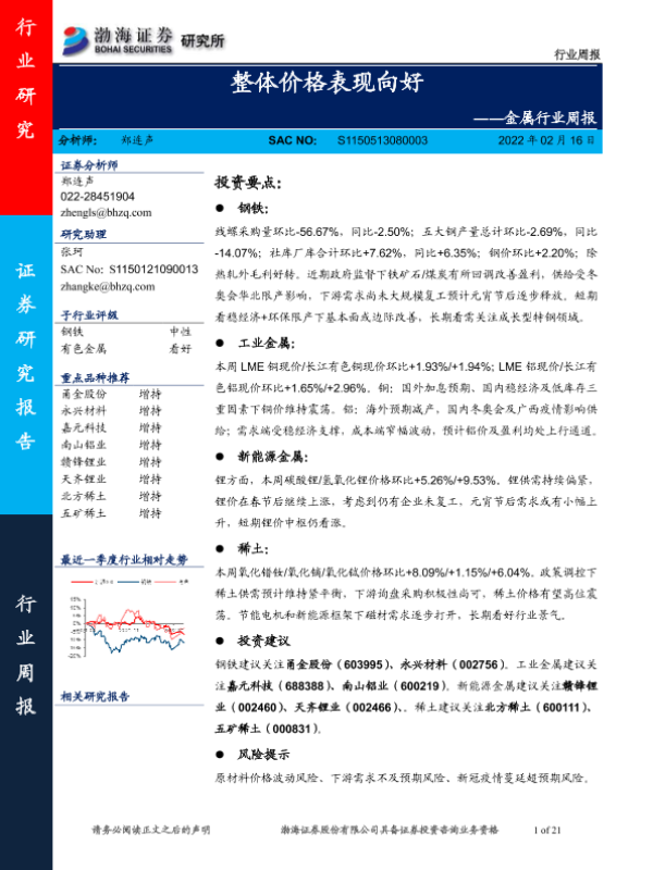 【渤海证券】【20220216】金属行业周报:整体价格表现向好-21页