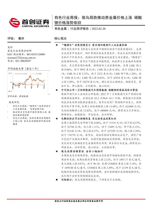 【首创证券】【20220220】20220220-首创证券-有色行业周报:俄乌局势推动贵金属价格上涨 碳酸锂价格涨势依旧-11页