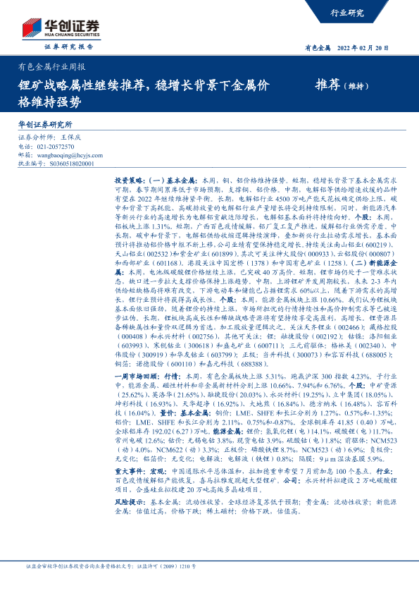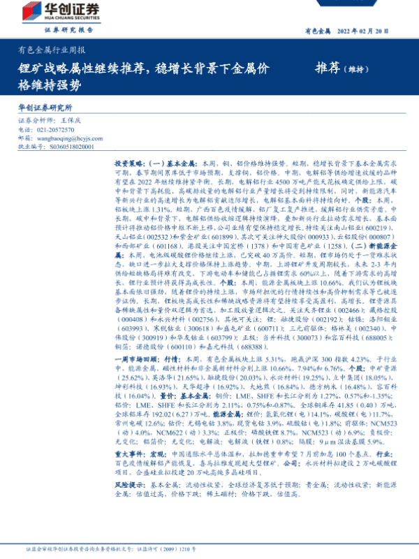 【华创证券】【20220220】20220220-华创证券-有色金属行业周报:锂矿战略属性继续推荐,稳增长背景下金属价格维持强势-16页