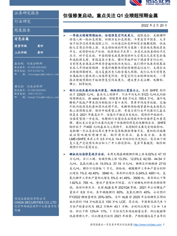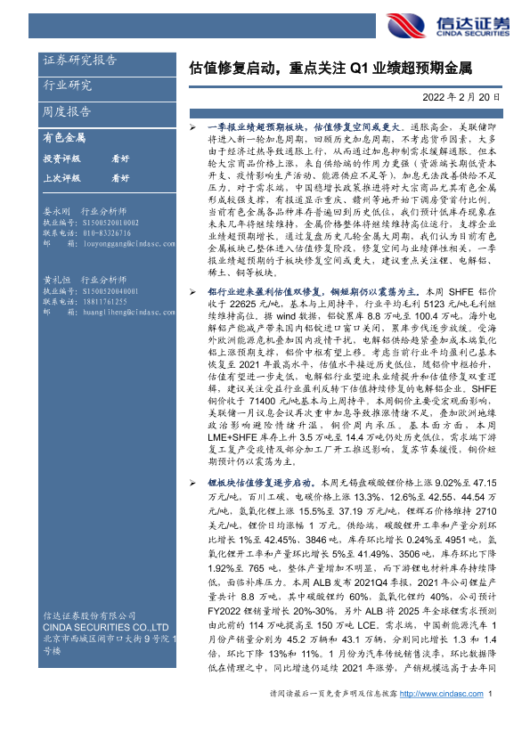 【信达证券】【20220220】20220220-信达证券-有色金属周度报告:估值修复启动,重点关注Q1业绩超预期金属-11页