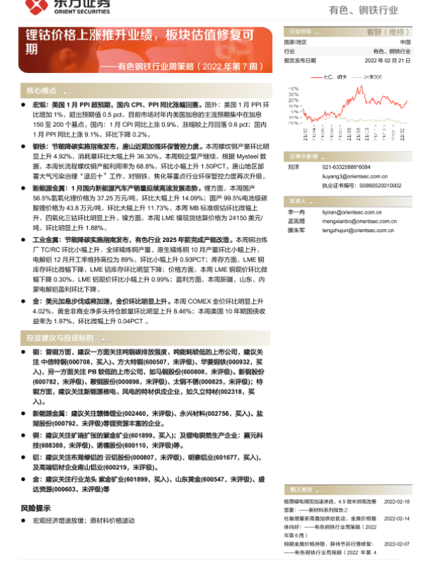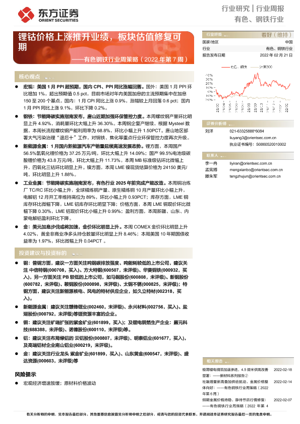 【东方证券】【20220221】有色钢铁行业周策略(2022年第7周):锂钴价格上涨推升业绩,板块估值修复可期-36页