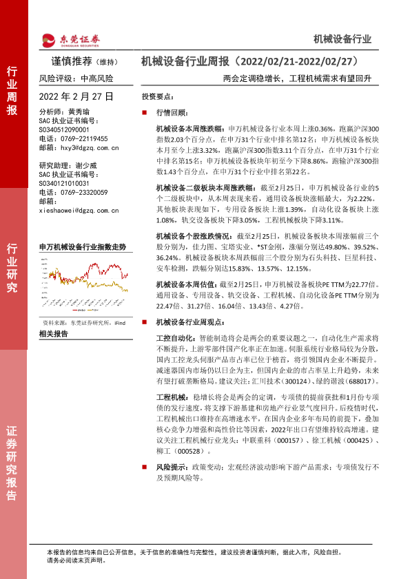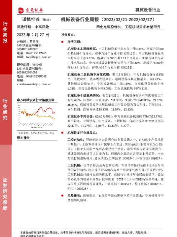 【东莞证券】【20220227】20220227-东莞证券-机械设备行业周报:两会定调稳增长,工程机械需求有望回升-12页