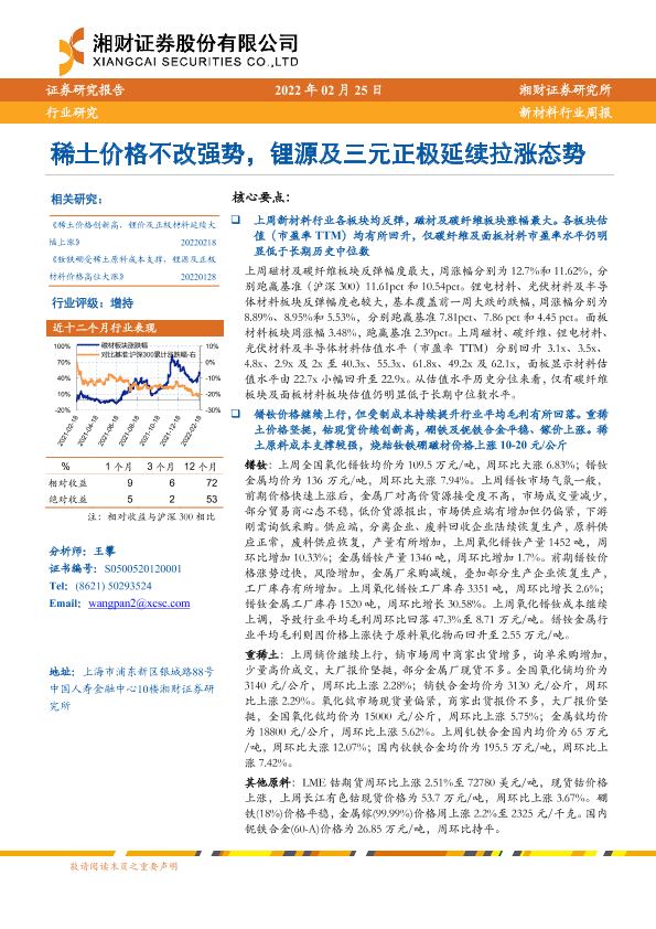【湘财证券】【20220225】20220225-湘财证券-新材料行业周报:稀土价格不改强势,锂源及三元正极延续拉涨态势-17页