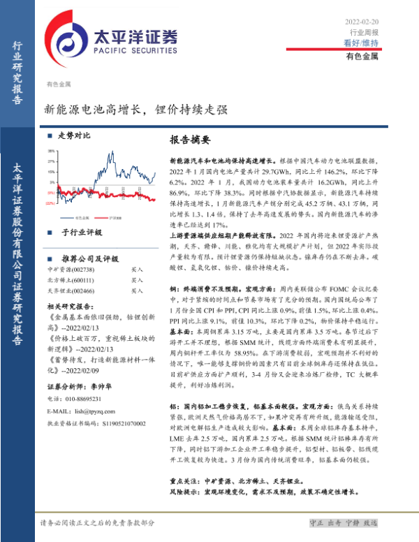 【太平洋证券】【20220220】20220220-太平洋-有色金属行业周报:新能源电池高增长,锂价持续走强-14页