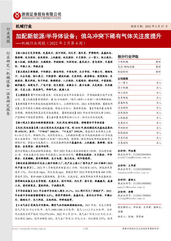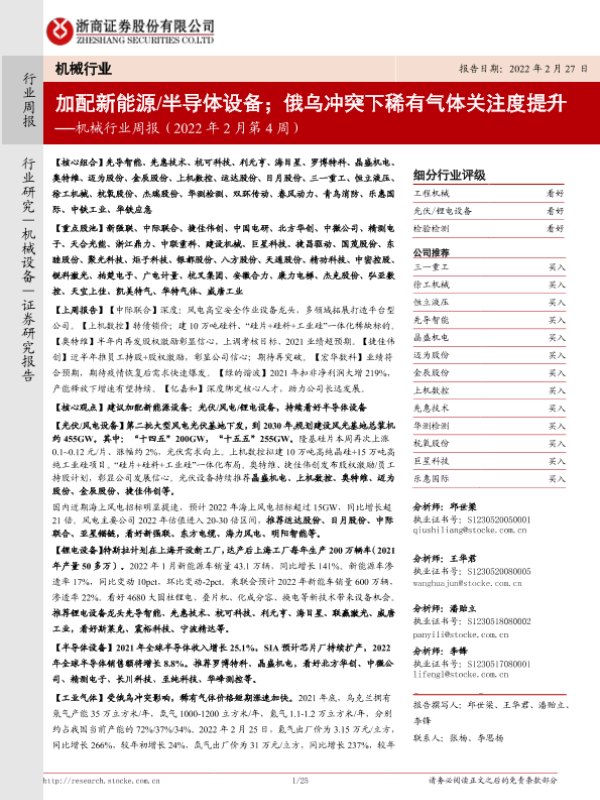 【浙商证券】【20220227】机械行业周报(2022年2月第4周):加配新能源/半导体设备;俄乌冲突下稀有气体关注度提升-25页