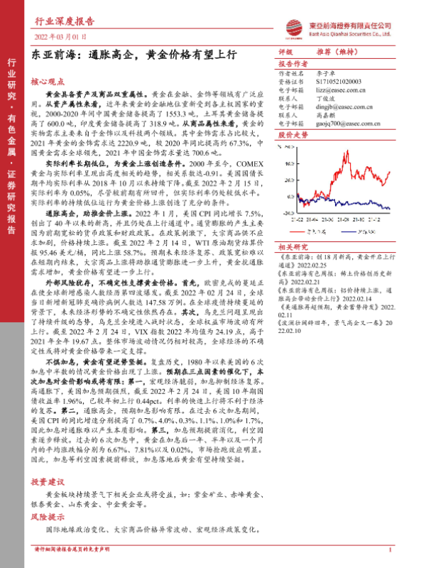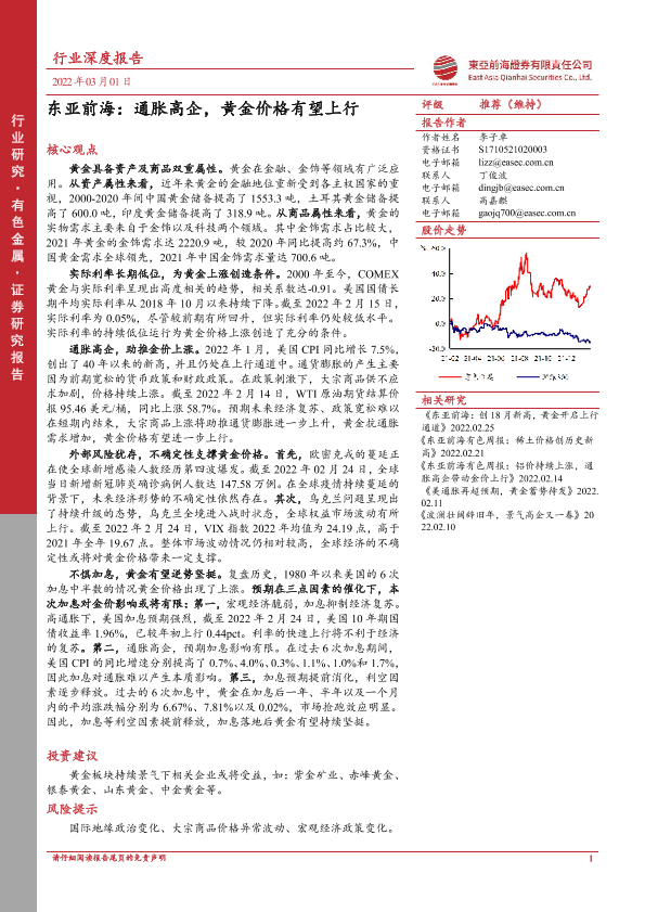 【东亚前海证券】【20220301】20220301-东亚前海证券-有色金属行业深度报告:通胀高企,黄金价格有望上行-42页