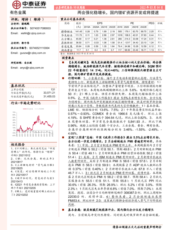【中泰证券】【20220304】20220304-中泰证券-有色金属行业周报:两会强化稳增长,国内锂矿资源开发或将提速-45页