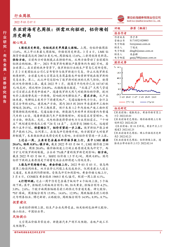 【东亚前海证券】【20220307】东亚前海有色周报:供需双向驱动,铝价续创历史新高-22页