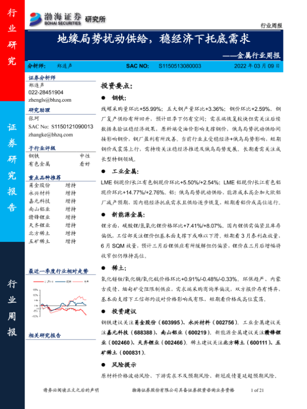 【渤海证券】【20220309】金属行业周报:地缘局势扰动供给,稳经济下托底需求-21页