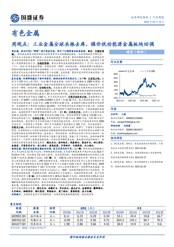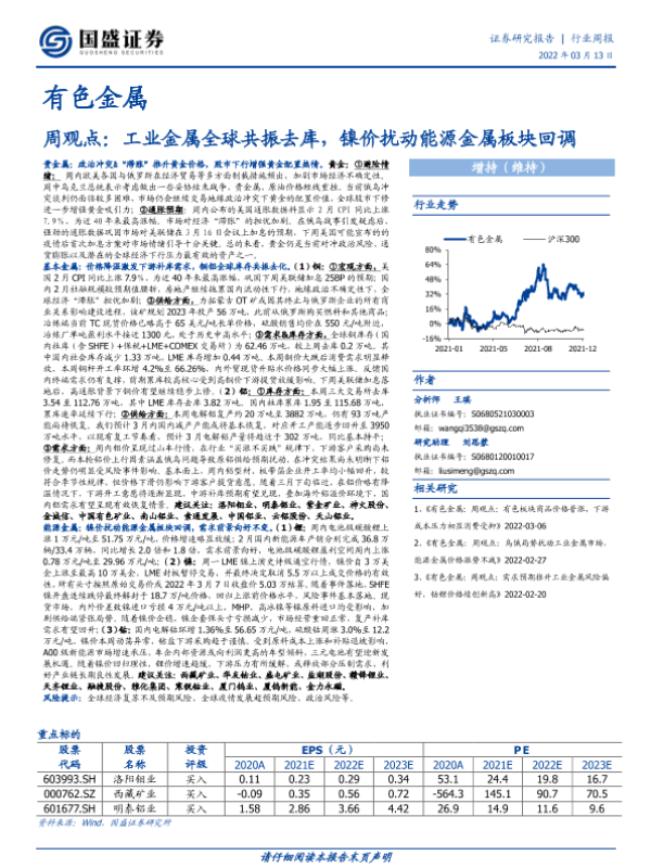 【国盛证券】【20220313】20220313-国盛证券-有色金属周观点:工业金属全球共振去库,镍价扰动能源金属板块回调-20页