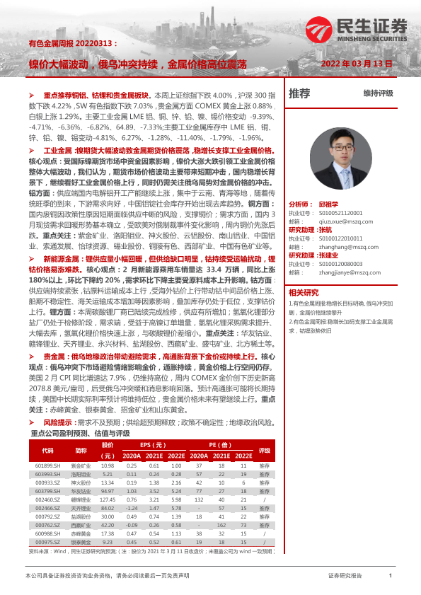 【民生证券】【20220313】20220313-民生证券-有色金属周报:镍价大幅波动,俄乌冲突持续,金属价格高位震荡-26页