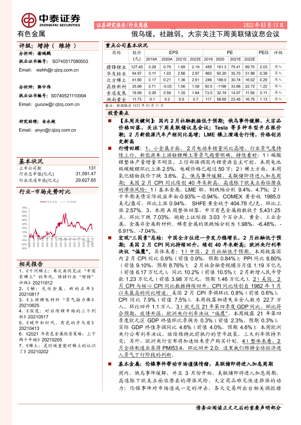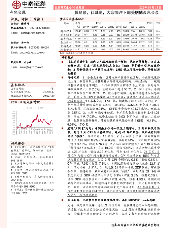 【中泰证券】【20220313】20220313-中泰证券-有色金属行业周报:俄乌缓,社融弱,大宗关注下周美联储议息会议-45页