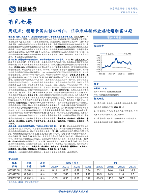 【国盛证券】【20220320】20220320-国盛证券-有色金属周观点:稳增长国内信心回归,旺季来临铜铝金属迎增配窗口期-21页