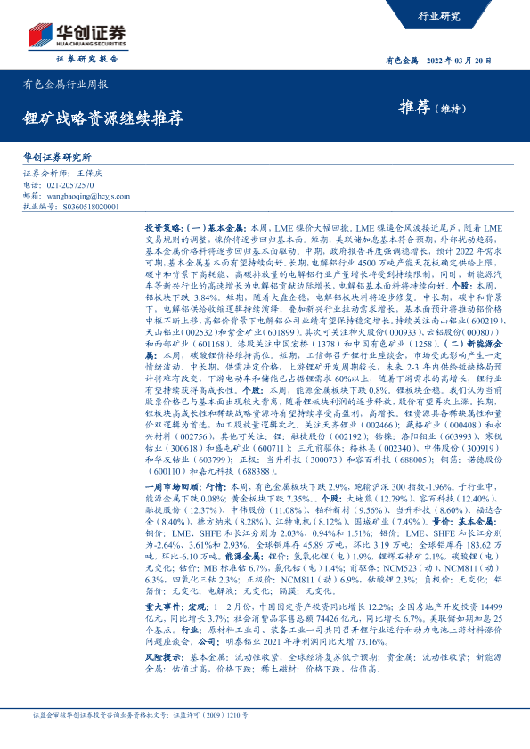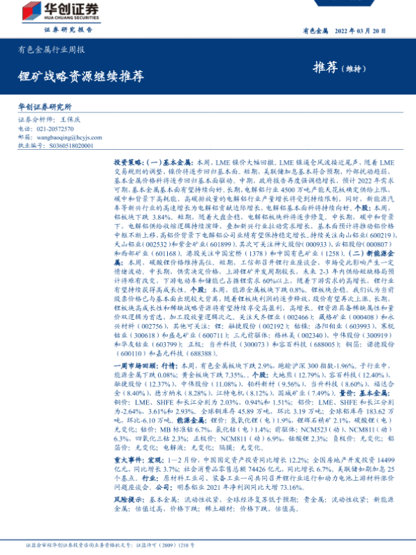 【华创证券】【20220320】20220320-华创证券-有色金属行业周报:锂矿战略资源继续推荐-15页