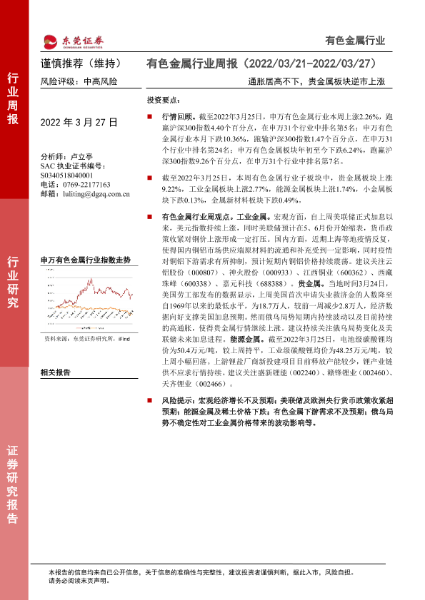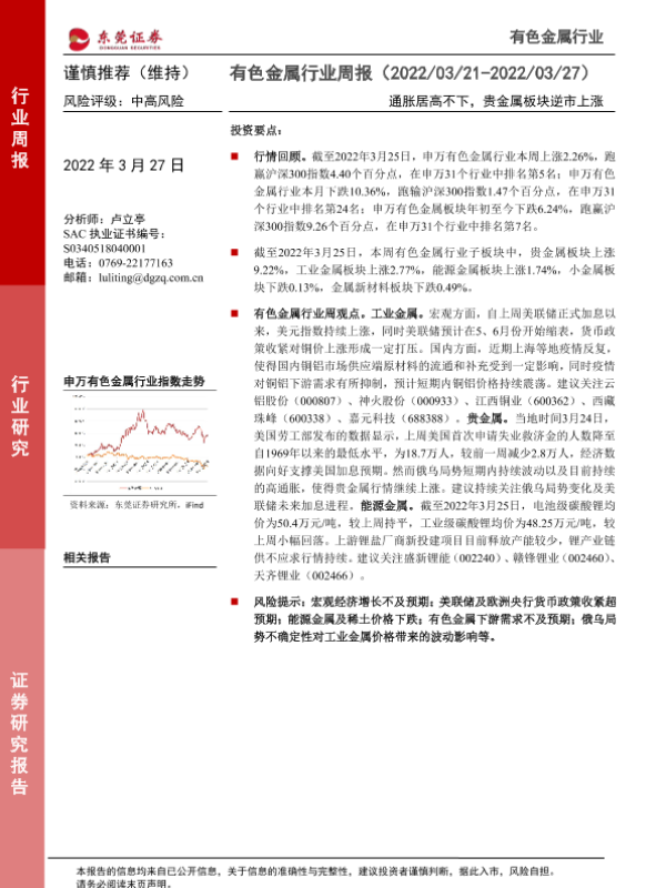 【东莞证券】【20220327】20220327-东莞证券-有色金属行业周报:通胀居高不下,贵金属板块逆市上涨-10页