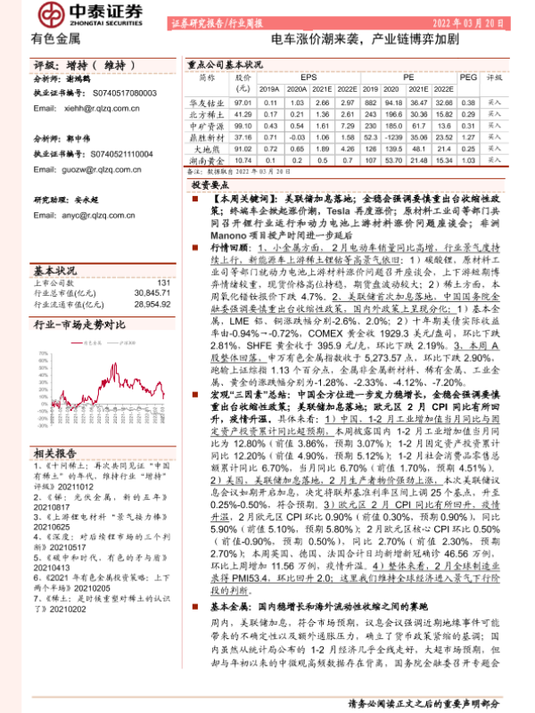 【中泰证券】【20220320】有色金属行业周报:电车涨价潮来袭,产业链博弈加剧-45页