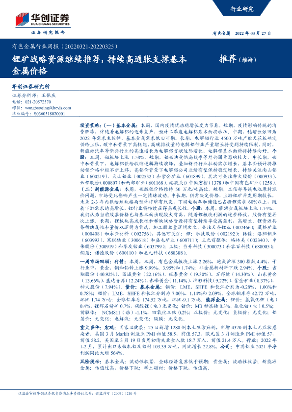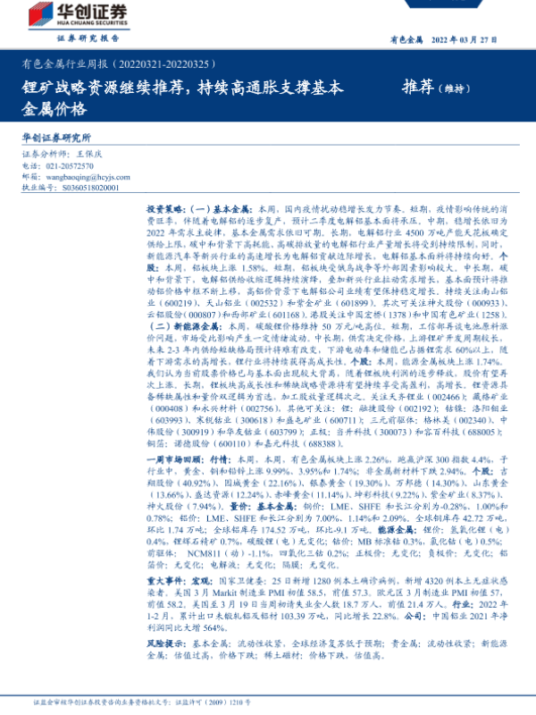 【华创证券】【20220327】20220327-华创证券-有色金属行业周报:锂矿战略资源继续推荐,持续高通胀支撑基本金属价格-16页