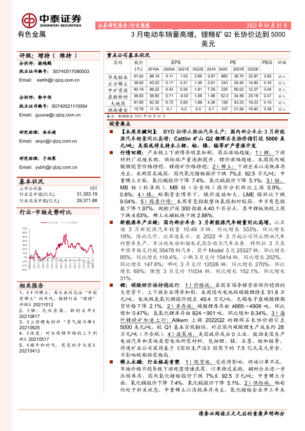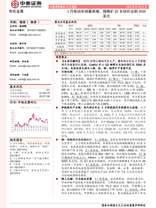 【中泰证券】【20220405】20220405-中泰证券-有色金属行业周报:3月电动车销量高增,锂精矿Q2长协价达到5000美元-24页