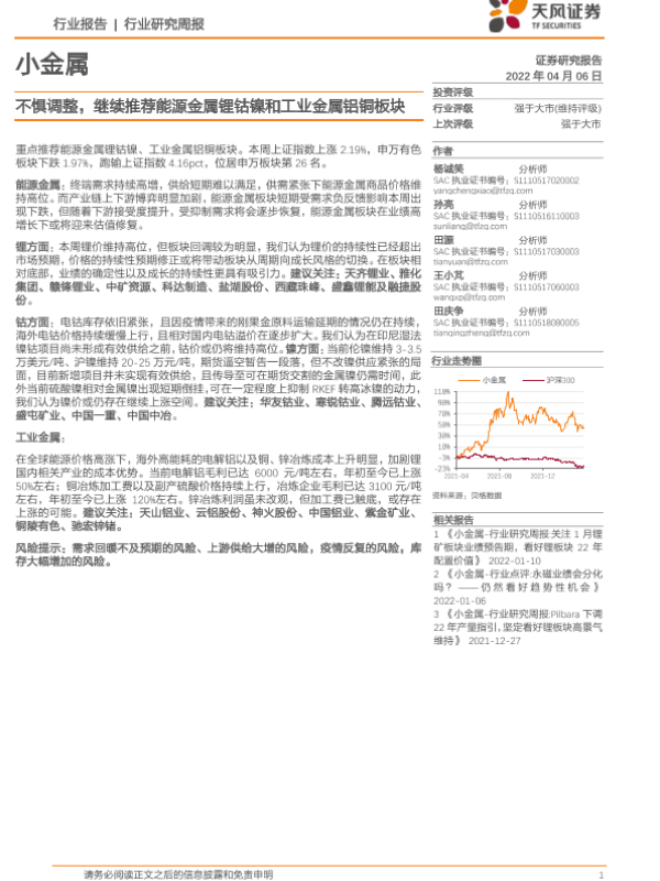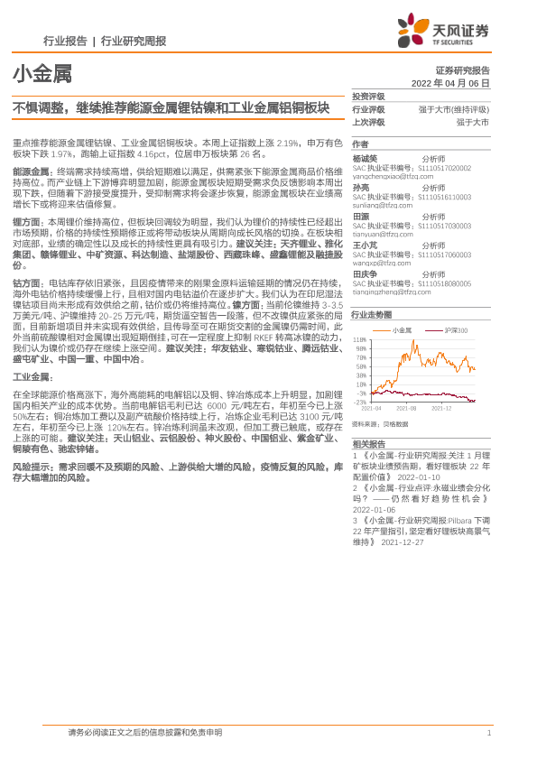 【天风证券】【20220406】20220406-天风证券-小金属行业研究周报:不惧调整,继续推荐能源金属锂钴镍和工业金属铝铜板块-20页