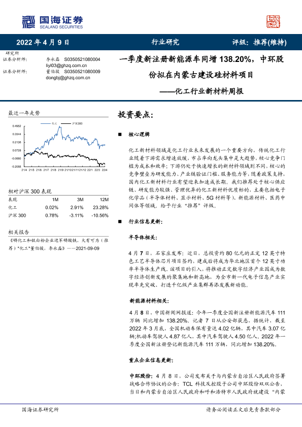 【国海证券】【20220409】20220409-国海证券-化工行业新材料周报:一季度新注册新能源车同增138.20%,中环股份拟在内蒙古建设硅材料项目-41页
