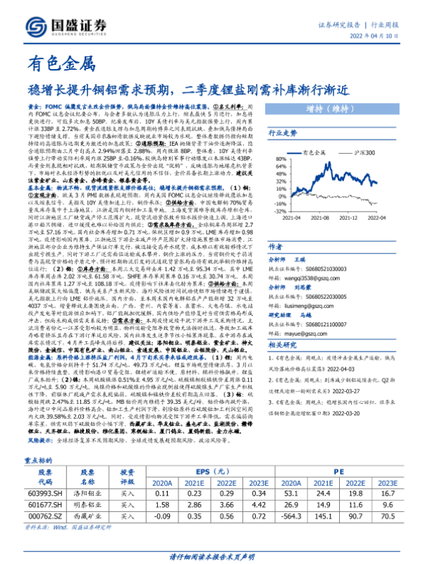 【国盛证券】【20220410】20220410-国盛证券-有色金属行业周报:稳增长提升铜铝需求预期,二季度锂盐刚需补库渐行渐近-20页
