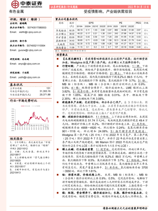 【中泰证券】【20220410】20220410-中泰证券-有色金属行业周报:受疫情影响,产业链供需双弱-25页