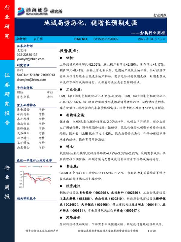 【渤海证券】【20220413】金属行业周报:地域局势恶化,稳增长预期走强-20页