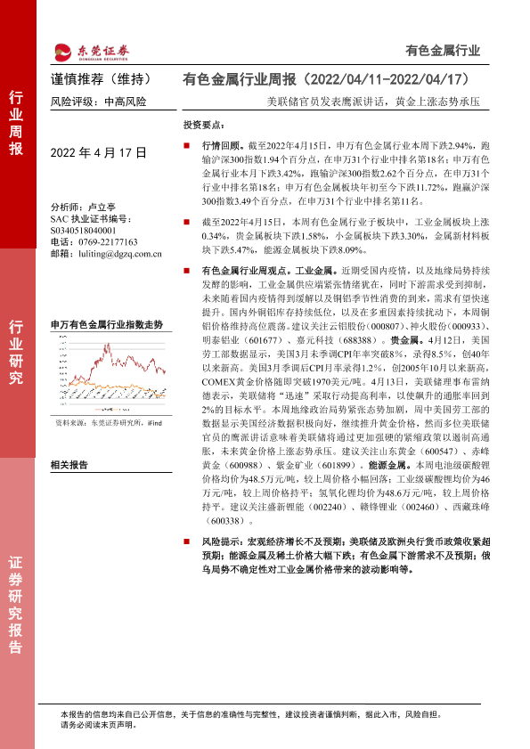 【东莞证券】【20220417】20220417-东莞证券-有色金属行业周报:美联储官员发表鹰派讲话,黄金上涨态势承压-10页