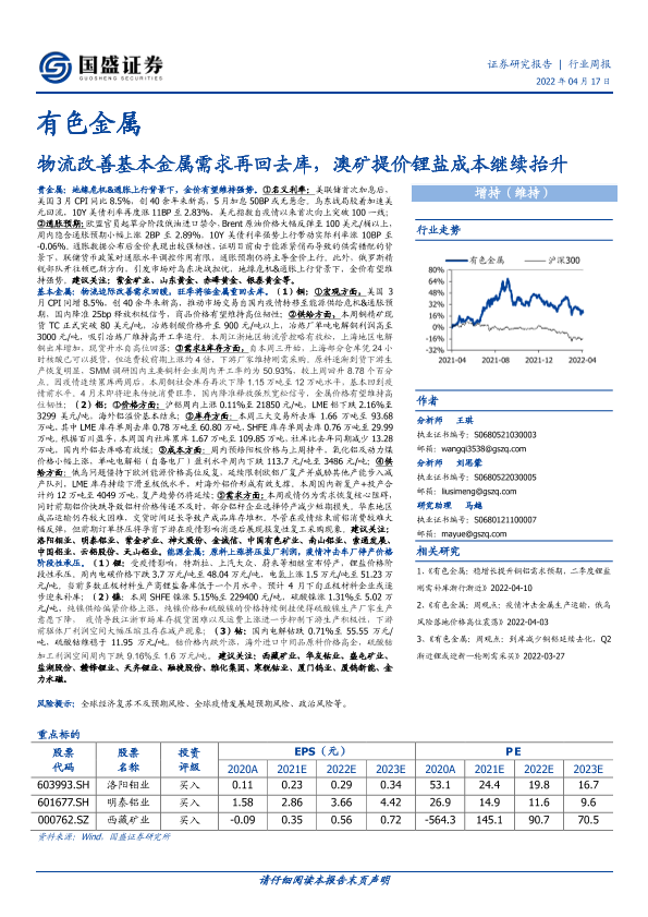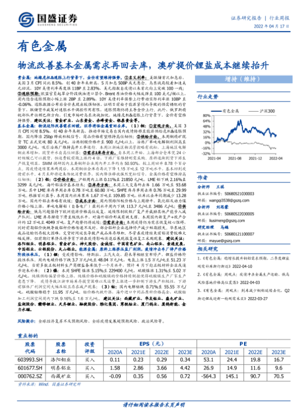 【国盛证券】【20220417】20220417-国盛证券-有色金属行业周报:物流改善基本金属需求再回去库,澳矿提价锂盐成本继续抬升-20页