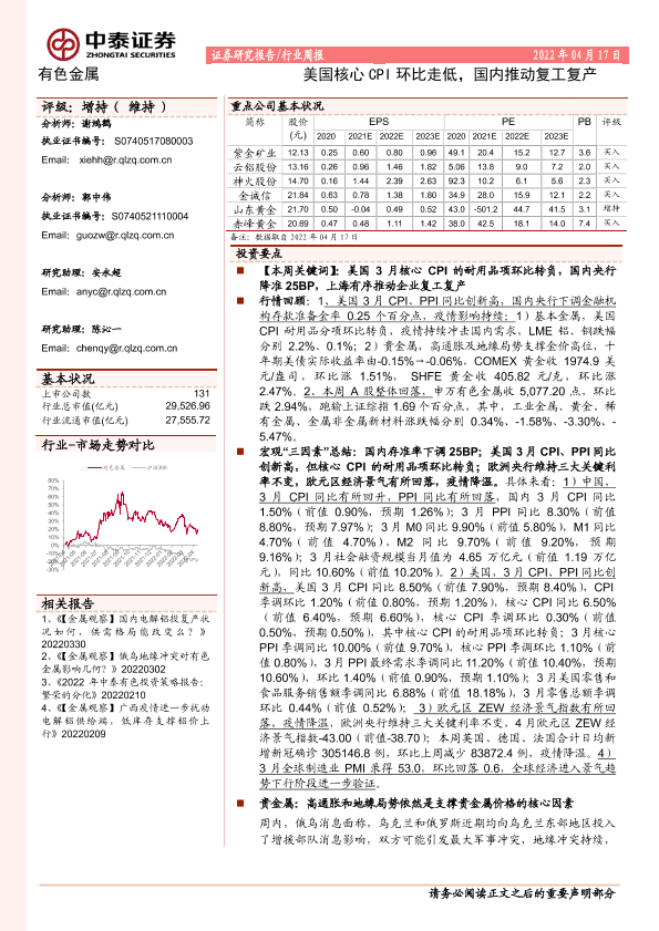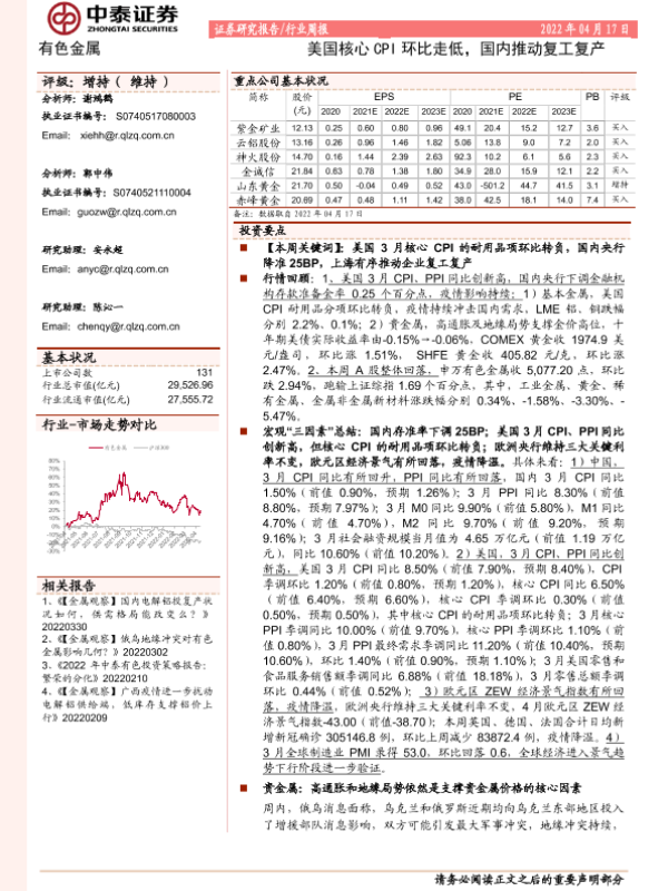 【中泰证券】【20220417】20220417-中泰证券-有色金属行业周报:美国核心CPI环比走低,国内推动复工复产-27页