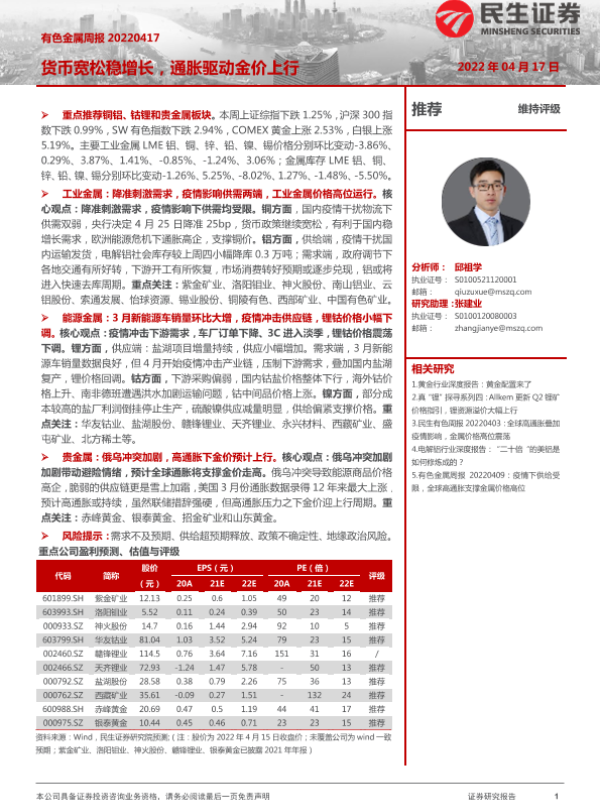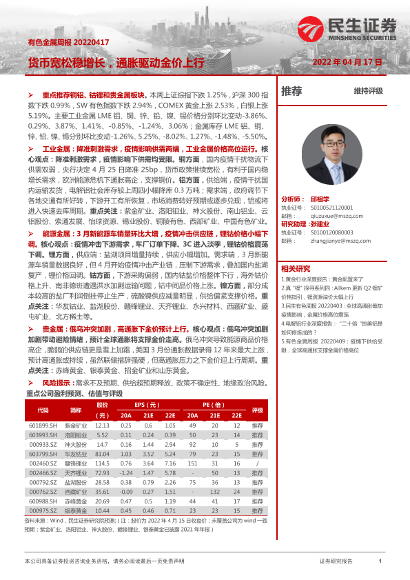 【民生证券】【20220417】20220417-民生证券-有色金属周报:货币宽松稳增长,通胀驱动金价上行-25页