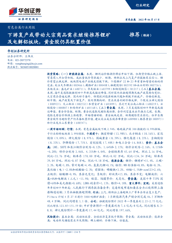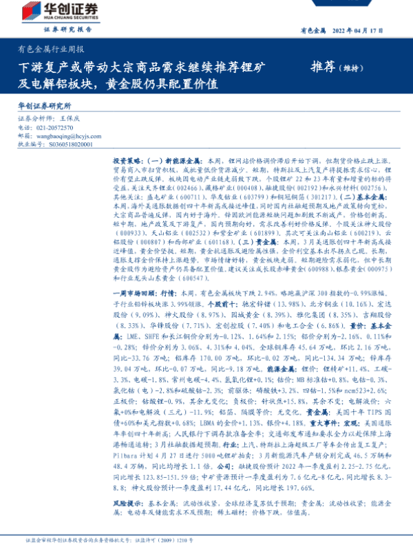 【华创证券】【20220417】20220417-华创证券-有色金属行业周报:下游复产或带动大宗商品需求继续推荐锂矿及电解铝板块,黄金股仍具配置价值-22页