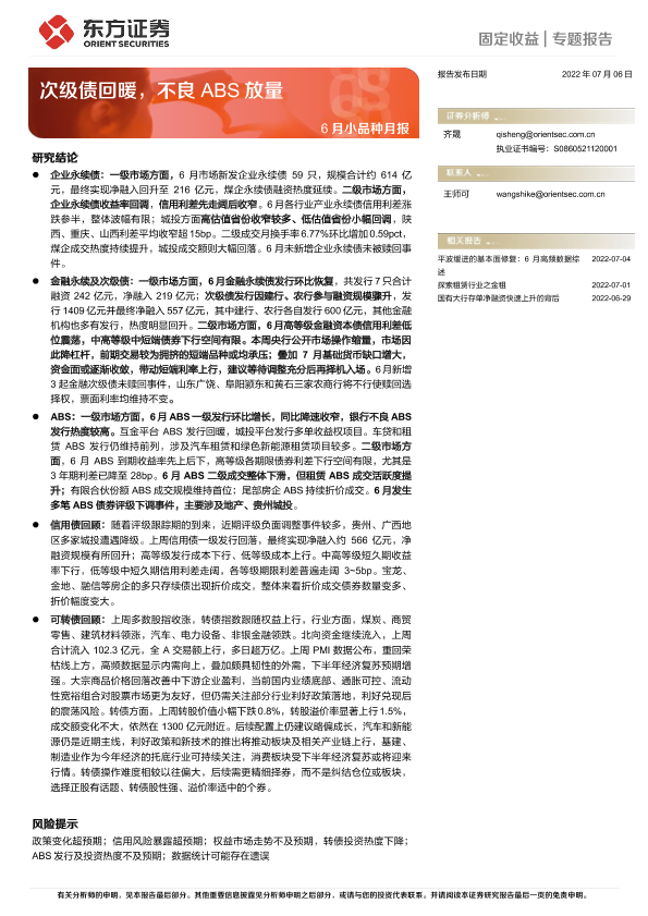 【东方证券】【20220706】6月小品种月报:次级债回暖,不良ABS放量-27页