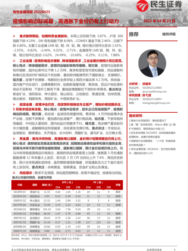 【民生证券】【20220423】20220423-民生证券-有色金属周报:疫情影响边际减弱,高通胀下金价仍有上行动力-25页