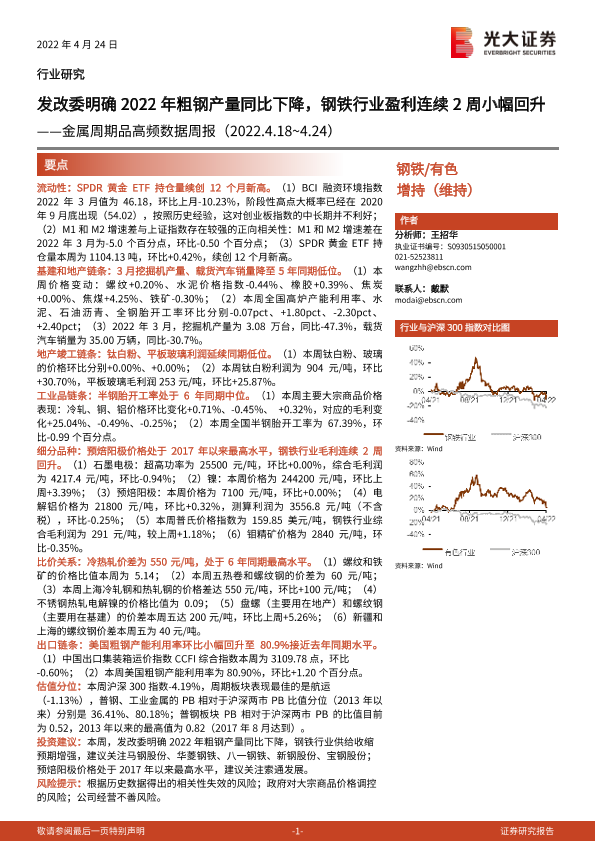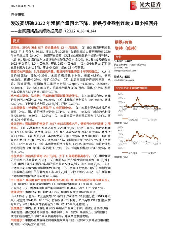 【光大证券】【20220424】金属周期品高频数据周报:发改委明确2022年粗钢产量同比下降,钢铁行业盈利连续2周小幅回升-26页