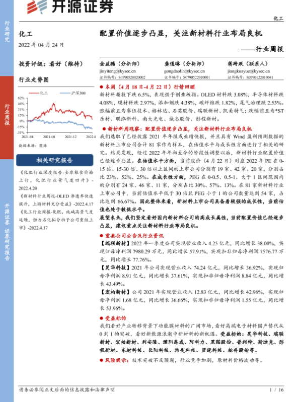 【开源证券】【20220424】20220424-开源证券-化工行业周报:配置价值逐步凸显,关注新材料行业布局良机-16页