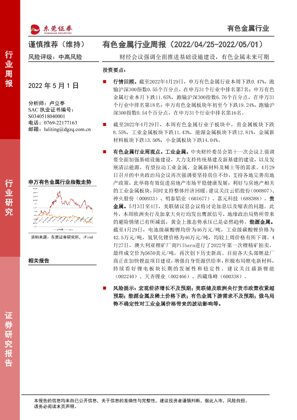 【东莞证券】【20220501】东莞证券-有色金属行业周报:财经会议强调全面推进基础设施建设,有色金属未来可期-10页