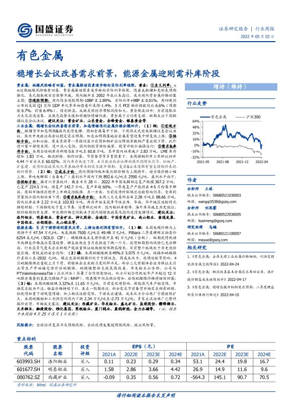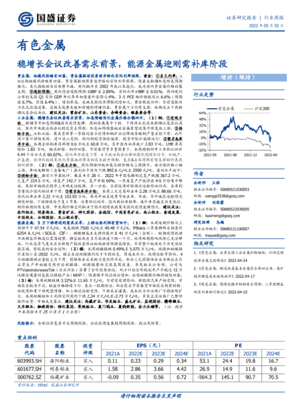 【国盛证券】【20220502】20220502-国盛证券-有色金属行业周报:稳增长会议改善需求前景,能源金属迎刚需补库阶段-21页