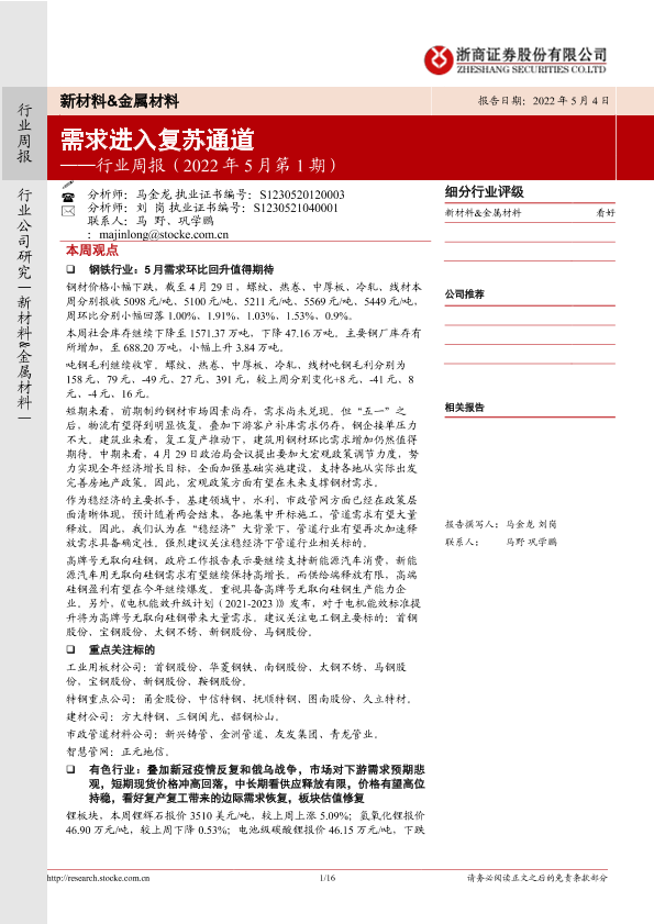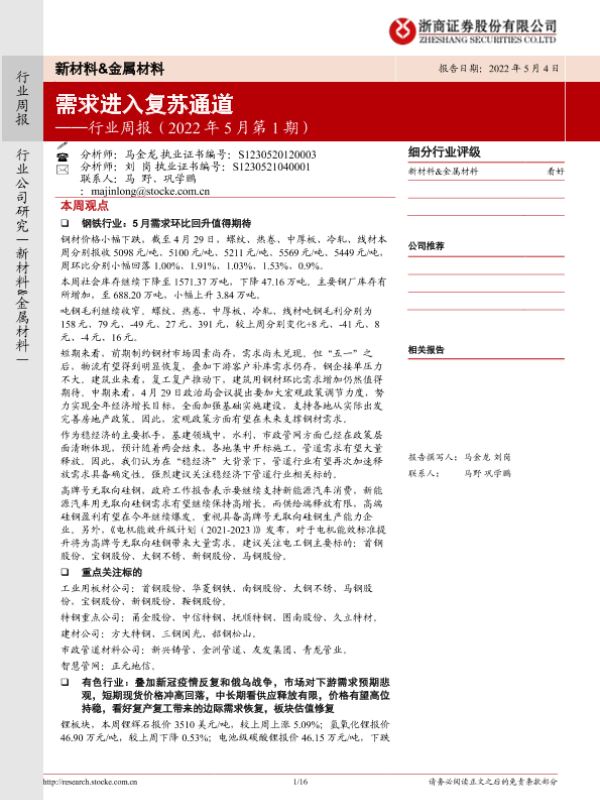 【浙商证券】【20220504】20220504-浙商证券-新材料&金属材料行业周报(2022年5月第1期):需求进入复苏通道-16页